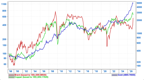 We had identified that oil was priced unsustainably low relative to other commodities coming into the year; the oil/copper ratio entered 2026 at levels last seen during the worst of the Covid lows. That anomaly has now largely corrected.