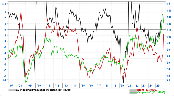 Chart 3: Oil is highly correlated to the industrial production cycle and metal prices