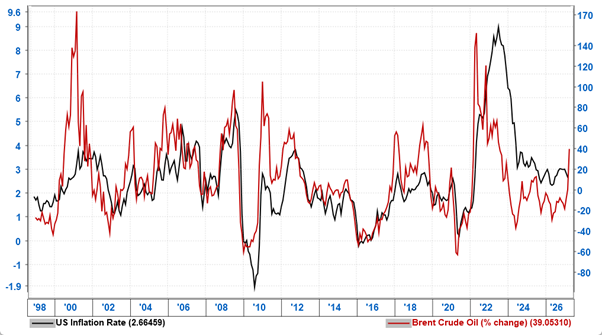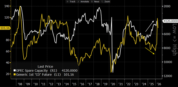 Last year it was observed that decreasing spare capacity in OPEC (ie increasing production) was inconsistent with the falling oil price. Should the crisis in the Strait be resolved, the level of OPEC spare capacity still implies that the oil price could remain higher for longer and certainly above the levels reached in late 2025, especially if the global economic cycle remains intact.