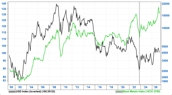 1. A continued weak US Dollar, a trend in place since October 2022, would remain supportive of commodity prices and emerging markets.