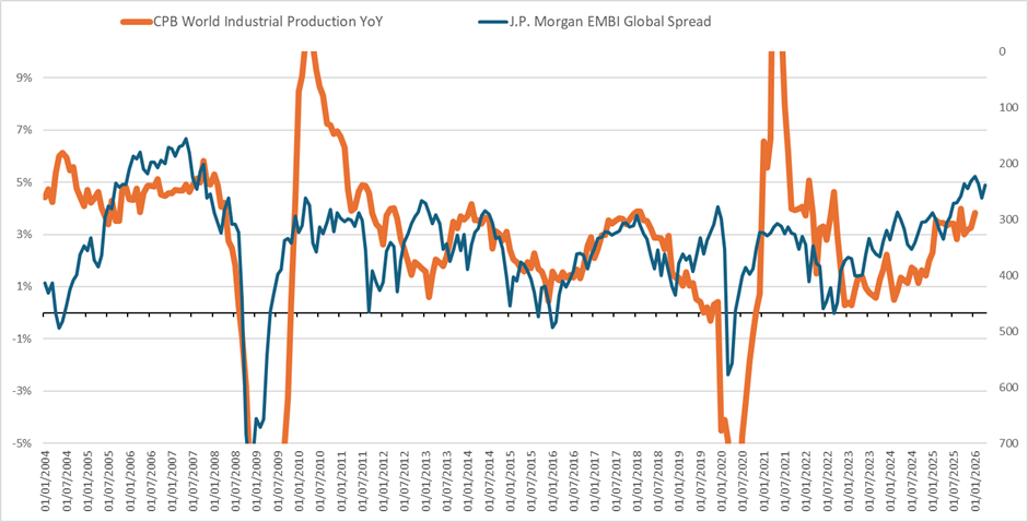 2. A resilient global economic backdrop: anticipating that the rebound in global industrial production (and consumption) would hold up and provide support for risk assets and high yield spreads.