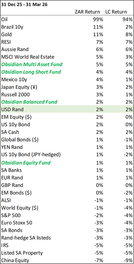 • The quarter was dominated by a sharp oil price surge, with oil rising 99% in ZAR terms. This represents one of the largest quarterly moves in the rand-denominated oil price in decades (the second-largest since the third quarter of 1990). The move provided significant tailwinds for commodity-exposed assets and contributed to the resilience of the resources sector.